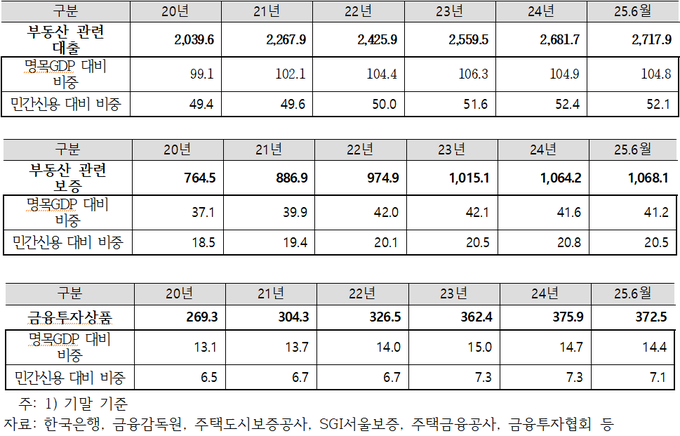 한편 부동산 관련 보증은 총 1천68조 1천억원이며, 가계보증(전세자금대출 등) 15조4천억원, 주택연금공급 6조2천억원이 각각 증가하고 사업자보증과 PF채무보증은 감소했다. 그리고 금융투자상품의 경우 총 372조 5천억원이며 MBS(주택저당증권)만이 감소했고, 부동산펀드·리츠·CP,회사채 등 모두 증가했다.