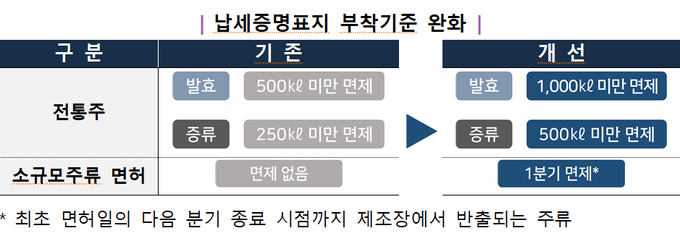 현재도 전통주의 경우 영세한 제조자를 지원하기 위해 주세 감면 대상 수량까지 납세증명표지를 부착하지 않도록 하고 있으며, 올해 초 법령개정으로 주세 감면 대상 수량이 발효주류의 경우 500㎘에서 1천㎘로, 증류주류는 250㎘에서 500㎘로 확대됨에 따라 납세증명표지 부착 제외 기준도 함께 완화할 수 있도록 제도개선에 착수했다.