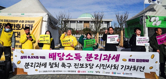 경실련과 참여연대 등 시민단체와 정의당·노동당·녹색당 등은 17일 정부의 배당소득 분리과세에 반대하는 기자회견을 열고, 조세정의와 세수확보 및 불평등 완화를 위해 고액 배당소득 분리과세를 철회할 것을 요구했다.