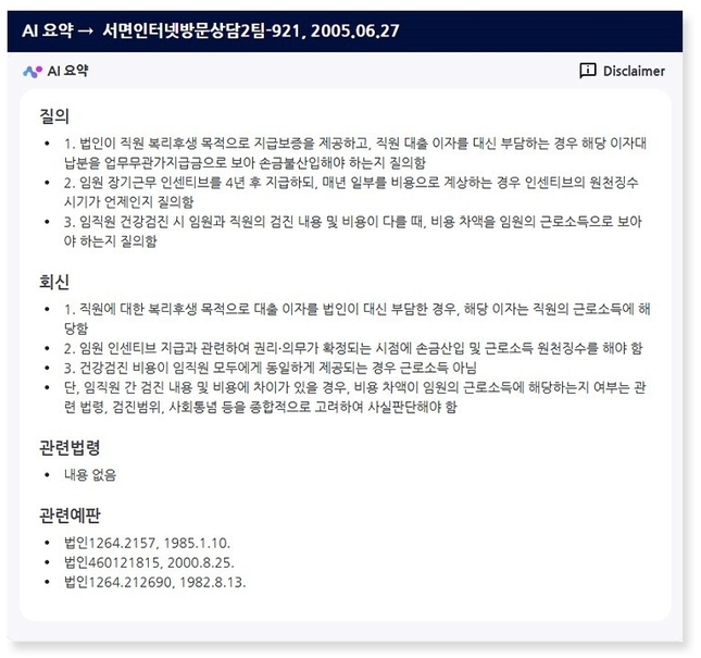단순 생성형AI가 일반 텍스트를 기반으로 문장을 재구성하는 방식인 데 비해, 삼일아이닷컴의AI 서비스는 실제 법령과 예규·판례, 행정해석 등 공식·전문 데이터만을 기반으로 요약을 생성한다는 점에서 차별화된다.