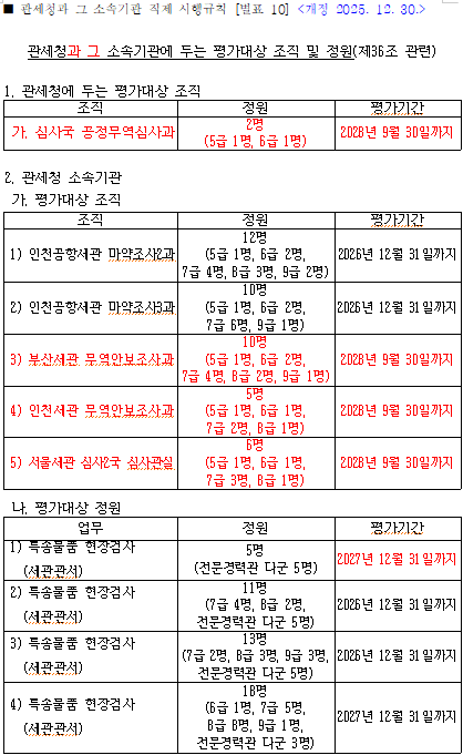 직제 시행개정안에 따르면, 관세청에 디지철 홍보기능 강화를 위해 6급 1명을 증원하고, 불공정 무역 대응을 위해 본청 심사국내 공정무역심사과를 오는 2028년 9월말까지 평가대상 기관으로 신설하면서 4급 1명·5급 1명·6급 1명을 증원하되 4급 1명은 기존 관세청 정원의 직급을 상향 조정한다.