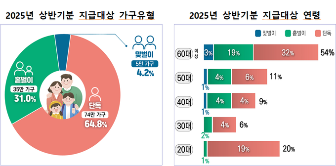 또한 가구 유형별 수급 현황으로는 단독가구가 74만 가구로 64.8%를 차지하는 등 수급자 3명 가운데 2명 비율이다. 홑벌이는 35만 가구(31%), 맞벌이는 5만 가구(4.2%)로 작년과 유사하다.