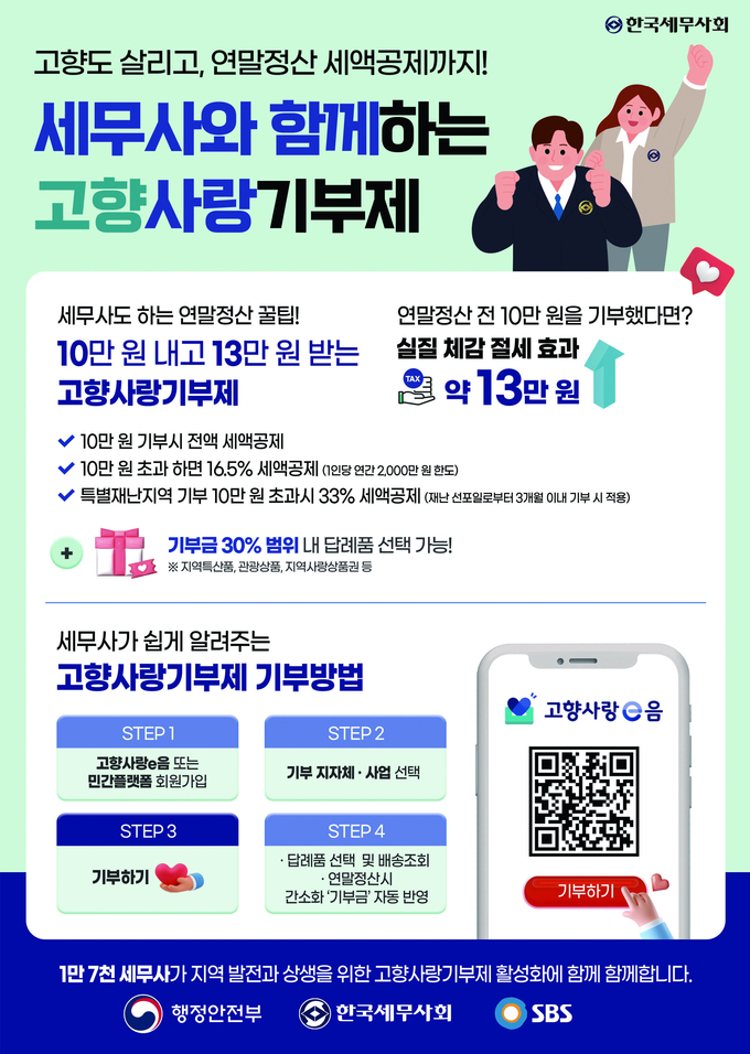 구재이 한국세무사회장은 “고향사랑기부금은 지역사회 기여와 세제 혜택을 동시에 얻을 수 있는 상생형 제도”라며 “특히 사업자는 필요경비 처리를 통해 법적 절세 효과를 극대화할 수 있어, 종합소득세 신고 시 유용하게 활용 가능하다”고 설명했다.
