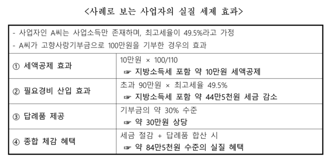 특히 기부금액에 따라 세금 절감 효과와 답례품까지 포함하면 체감 혜택이 약 84.5%에 이를 수 있다고 설명했다.
