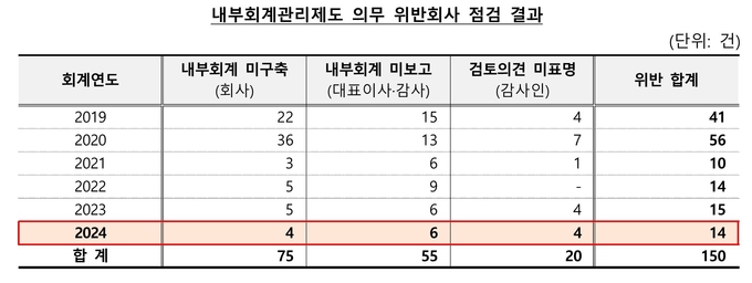 2024 회계연도 내부회계관리제도 점검 결과, 총 14건(회사 4건, 대표이사 6건, 감사인 4건)의 위반이 발견됐다. 내부회계관리제도 미구축 4건, 운영실태·평가 미보고 6건, 검토의견 미표명 4건이다. 증권선물위원회는 이 중 7건(대표이사 4건, 감사인 3건)에 대해 300~840만원의 과태료를 부과했다.