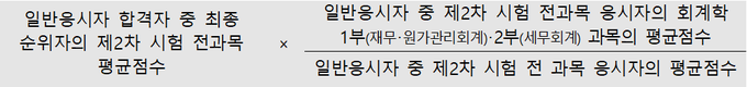 반면, 일반응시자 가운데 전 과목 평균점수가 60점 이상인 사람이 최소 합격인원(700명) 미만인 경우 국세경력자는 응시한 과목(회계학 2과목) 전체의 평균 점수를아래 계산식에 따라 계산한 점수 이상인 경우만 합격자로 결정한다.