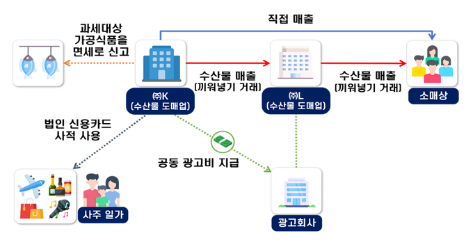 ㈜K는 사주가 지배하는 특수관계법인 ㈜L을 유통과정에 끼워 넣어 00억원의 이익을 분여하였으며, 이로 인해 유통비용이 상승했다. 이 과정에서 ㈜K는 부가가치세 과세대상인 가공한 수산물을 면세로 신고해 부가가치세를 신고 누락했으며, ㈜L과 공동으로 부담해야 할 광고비를 혼자 부담한 것으로 신고해 경비를 부풀리고, 특수관계법인 ㈜L에 이익을 분여했다. 또한 사주 일가는 법인 신용카드를 골프・해외여행・유흥비 등에 사적으로 사용한 것으로 드러났다.