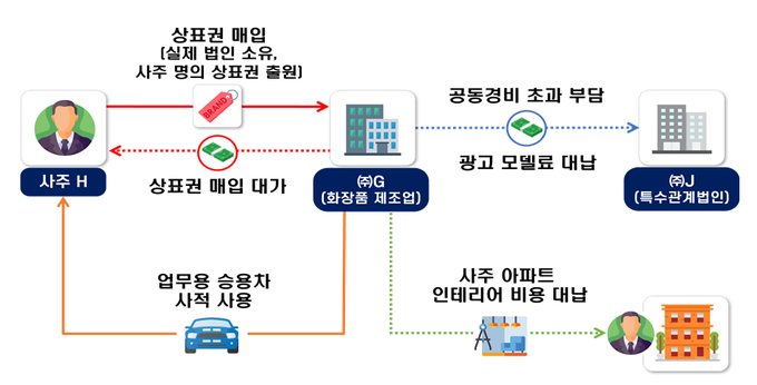 ㈜G는 법인의 자원과 비용으로 상표권을 개발했으나, 사주 H 명의로 상표권을 출원한 후 법인이 상표권을 매입해 사주 H에게 00억원을 대가로 지급하며 법인자금을 부당 유출했으며, ㈜G는 특수관계법인 ㈜J와의 공동경비를 초과 부담하고, 광고 모델료를 대신 지급하는 방식으로 00억원의 이익을 분여했다.