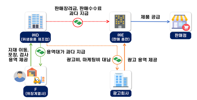 또한 ㈜D의 퇴직자 명의 위장계열사 F를 설립하게 한 후 F에 자재 이동, 포장 및 검사 용역대가를 과다 지급해 법인자금을 유출했으며,㈜D는 판매 총판인 ㈜E가 부담해야 할 광고비 및 마케팅비를 대신 지급하는 것은 물론, ㈜D는 각종 비용 등을 부풀려 제품 가격을 인상했으며 가격 인상에 따른 이익 000억원을 ㈜E에게 분여한 혐의를 받는다 .
