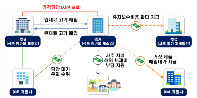 ㈜A와 담합업체 ㈜B는 가격담합 모의 직후, 업체들끼리 서로 원재료를 고가 매입한 것처럼 조작하는 방식으로 매입단가를 부풀려 가격 인상에 따른 회사 이익 00억 원을 축소했으며, ㈜A는 ㈜B로부터 가격담합 대가를 받기 위해 ㈜B의 계열사에 식재료 공급 명목으로 거짓 세금계산서를 발급하고 담합대가를 우회 수취했다.