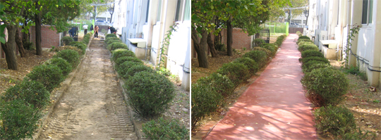 <사진설명>구로서 건물 뒷길의 변신. 왼쪽은 공사 중이던 모습, 오른쪽은 작업이 완료된 후 모습.