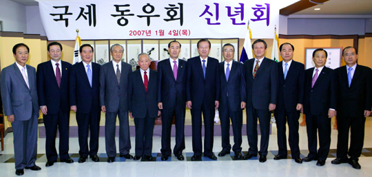 전현직 국세공무원 모임인 국세동우회(회장 추경석)는 4일 국세청 연회장에서 전군표 국세청장 등 700명이 참석한 가운데 신년 하례식을 가졌다. 왼쪽부터 이주성 전 국세청장, 이용섭 건교부장관, 김성호 전 보건복지부장관, 서영택 전 건교부장관, 고재일 전 건교부장관, 전군표 국세청장, 추경석 동우회장, 임채주 전 국세청장, 이건춘 전 건교부장관, 손영래 전 국세청장, 구종태 전 국회의원, 김정부 전 국회의원.