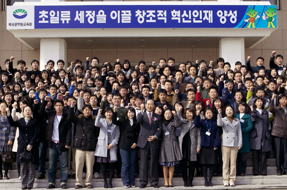 전군표 국세청장이 9급 신규임용자들과 화이팅 하고 있다.