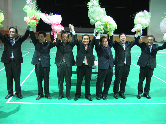 제25대 세무사회장에 당선된 조용근 당선자(사진 가운데)와 7인의 당선자들이 개표결과를 발표한 이후 환호하고 있다.(사진 왼쪽부터 송주섭 감사 당선자, 정해욱 감사, 황정대 부회장, 조용근 당선자, 임정완 부회장, 임채용 부회장, 채수인 윤리위원장 당선자)