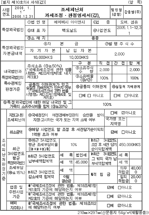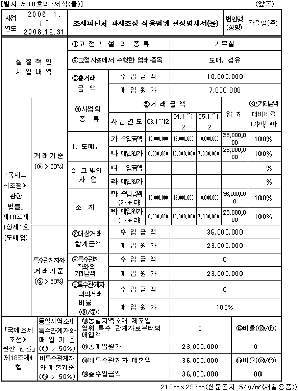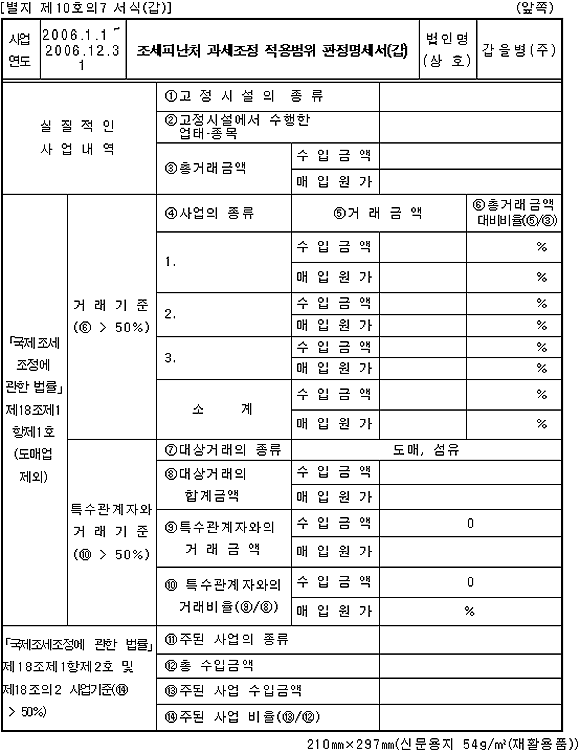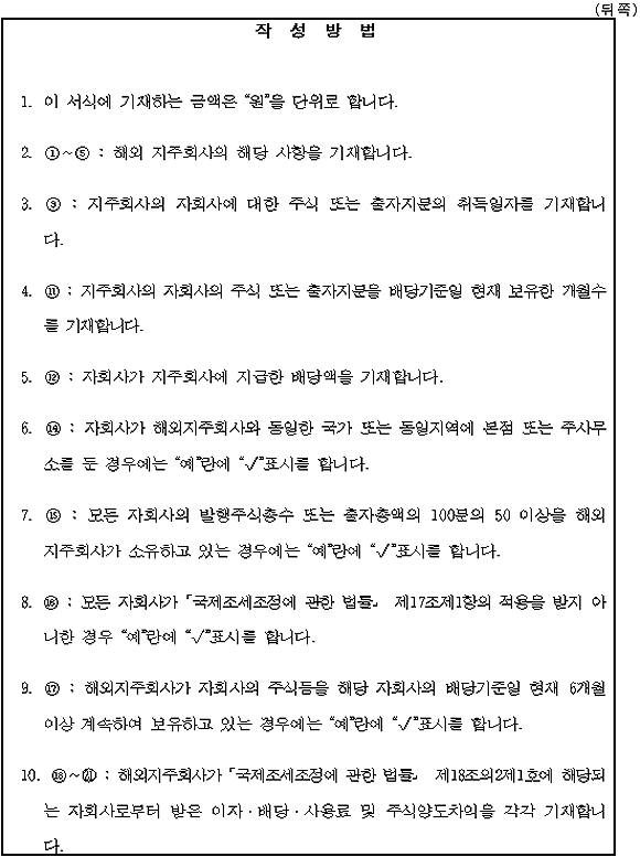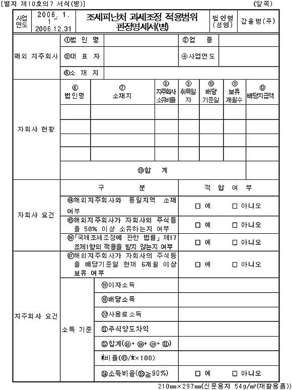 ․ 조세피난처 과세조정 적용범위 판정명세서(갑)(별지 제10호의7 서식(갑))