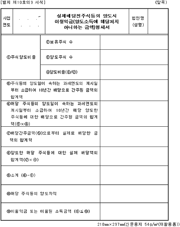 ․ 실제배당전주식등의 양도시 이월익금(양도소득에 해당되지 아니하는 금액) 명세서(별지 제10호의9 서식)