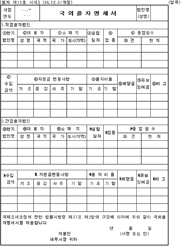 ○ 국외지배주주로부터 자금을 차입(지급보증을 포함함)한 내국법인은 재정경제부령이 정하는 국외지배주주에게 지급하는 이자에 대한 조정명세서 및 원천징수세액조정명세서를 법인세 확정신고시 납세지 관할세무서장에게 제출하여야 합니다.(국조법시행령 제28조의 2)