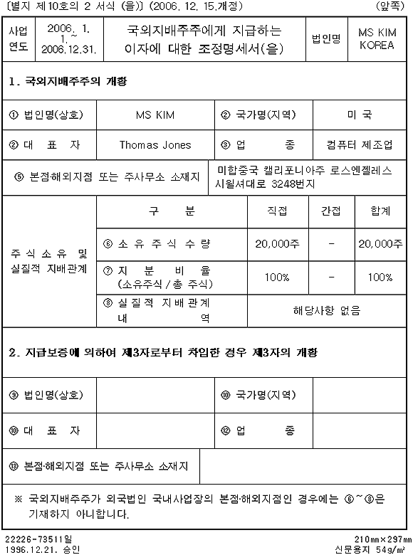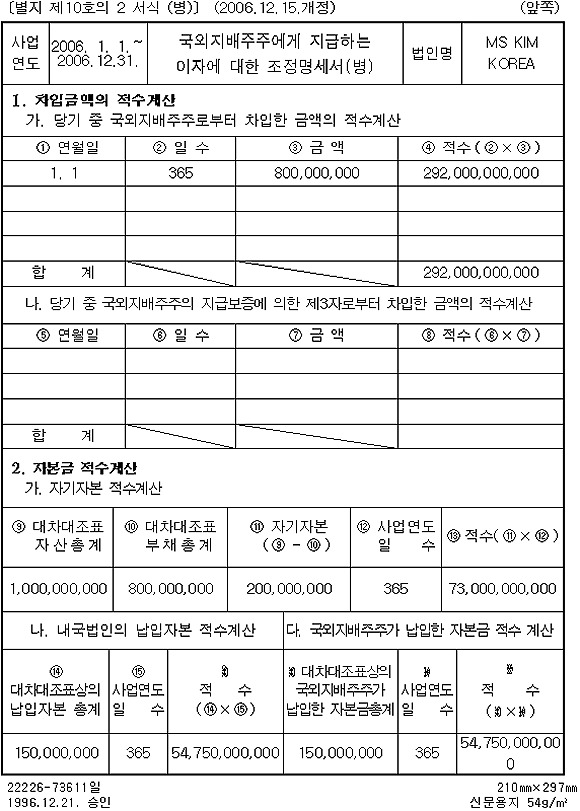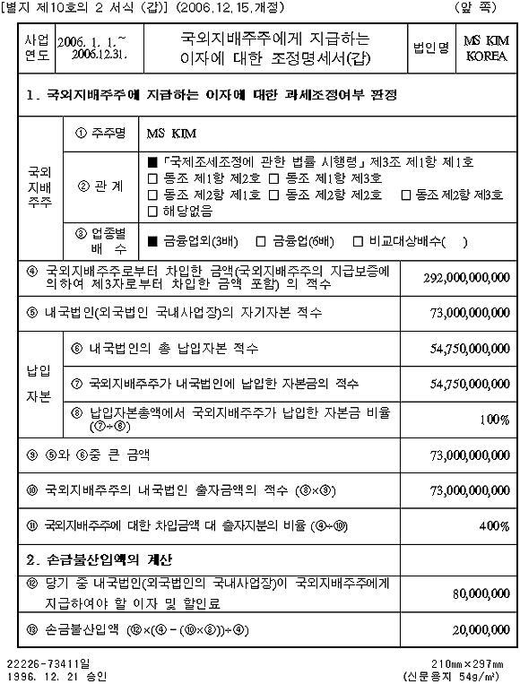 ○ 미국의 모회사는 2006.1.1. 한국의 자회사에 200,000,000원을 추가로 대출하였고(연 이자율 10%), 한국의 자회사는 모회사의 지급보증에 의하여 국내은행에서 400,000,000원을 차입하였음(연 이자율 10%)