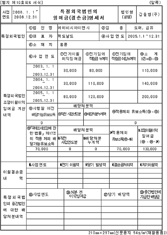 ․ 특정외국법인의 잉여금(결손금)명세서(별지 제10호의6 서식)