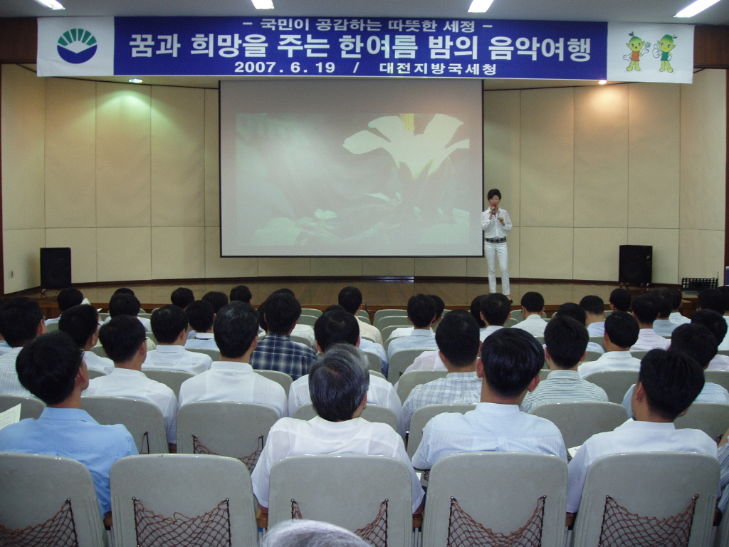 대전지방국세청(청장 김남문)은 19일 오후 6시 청 대강당에서 전문 노래지도 강사를 초빙해 ‘꿈과 희망을 주는 한여름 밤의 음악여행’ 행사를 가졌다.