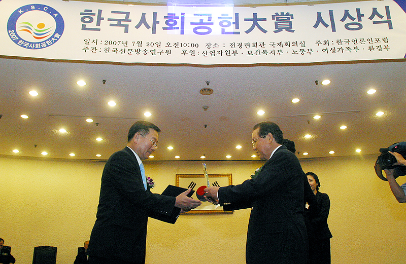 신한은행(www.shinhan.com 은행장 신상훈)은 지난 20일(금) 오전 10시 여의도 전경련 국제회의장에서 한국언론인 포럼이 주최하고 산업자원부, 보건복지부, 여성가족부 등 3개 정부부처가 후원하는 ‘2007 한국사회공헌대상’ 시상식에서 영예의 종합대상과 산업자원부장관상을 수상했다.