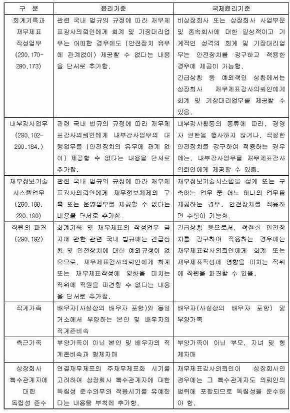 이 비교표에는 ▶서언 ▶부당경쟁 금지 ▶알선수수료 ▶재무적 이해관계 ▶대출과 보증 ▶가족관계 및 개인적 관계 ▶인증의뢰인과의 고용관계 ▶동일한 업무담당파트너의 교체규정 ▶인증의뢰인에 대한 비인증업무의 제공 ▶회계기록과 재무제표 작성업무 ▶내부감사업무 ▶재무정보기술 시스템업무 ▶직원의 파견 ▶직계가족 ▶측근가족 ▶상장회사 특수관계자에 대한 독립성 준수 등 모두 16개 항목이 요약돼 있다.