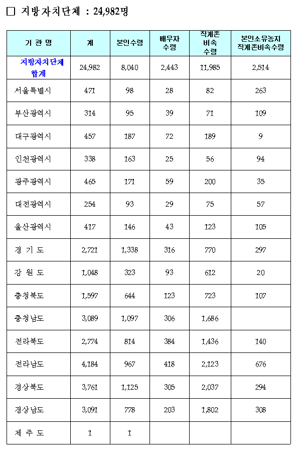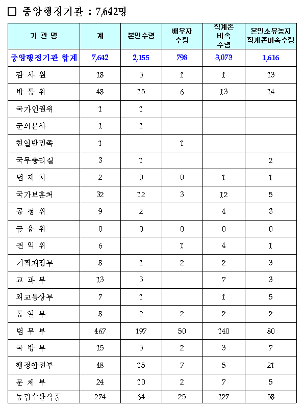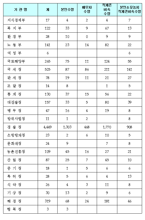 중앙행정기관의 경우 쌀 직불금 수령 및 자진신고가 가장 많은 기관은 경찰청으로 4천449명이었고, 국세청은 525명이었다. 관세청은 78명으로 나타났다. 지방자치단체에서는 전남도와 경북도가 각각 4천184명과 3천761명으로 가장 많았다.