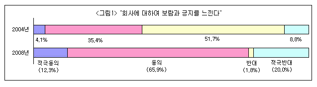 4년전 같은 조사(39.5%)에 비해 약 2배가량 늘어난 수치다. 또 대기업(82.6%)이나 중소기업(73.2%), 사무직(82.1%)이나 생산직(76.6%)에 관계없이 회사에 대한 자부심이 높은 것으로 나타났다.