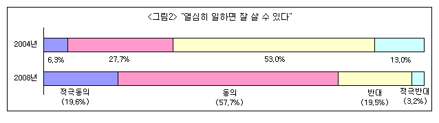 근로에 대한 가치관도 크게 변했다. 4년전 조사에서는 ‘열심히 일해도 잘 살 수 없다’는 비관적 응답이 66.0%를 차지했으나, 이번 조사에서는 반대로 ‘열심히 일하면 잘 살 수 있다’는 긍정적 응답비율이 77.3%에 달했다.