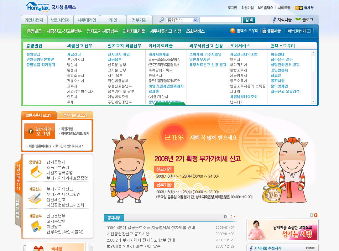 이외에도, 개인사업자, 법인사업자, 세무대리인, 개인, 정부기관별로 각각의 유형에 필요한 메뉴만으로 구성된 이용자 맞춤 메뉴화면을 제공한 것도 특징이다.