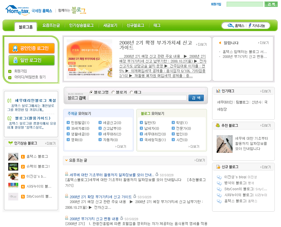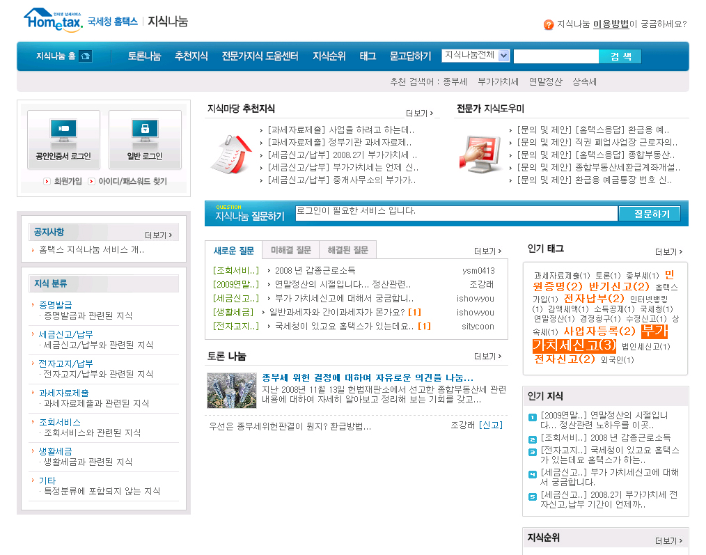 국세청은 홈택스를 새롭게 개편하면서 네이버의 '지식-in'과 다음의 '신지식'과 같은 개념의 '지식나눔' 코너가 신설됐고, 세무 정보의 개인 공간인 '블러그'도 신설했다.