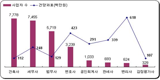2011년 국세통계연보에 따르면, 개인으로 활동하는 전문직 사업자의 수는 건축사, 세무사, 법무사 순으로 많았으며, 평균 매출액은 변리사, 변호사, 관세사 순으로 집계됐다.