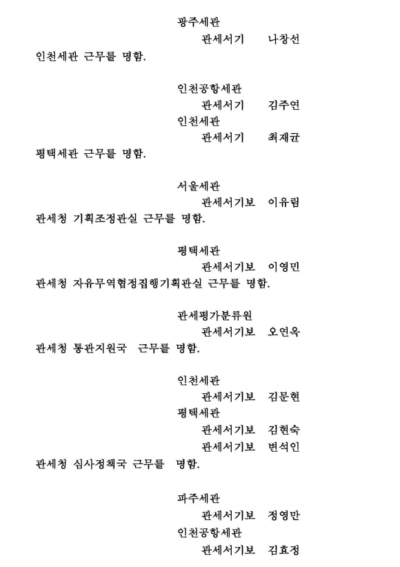 관세청 6급 이하직원 전보[명단]