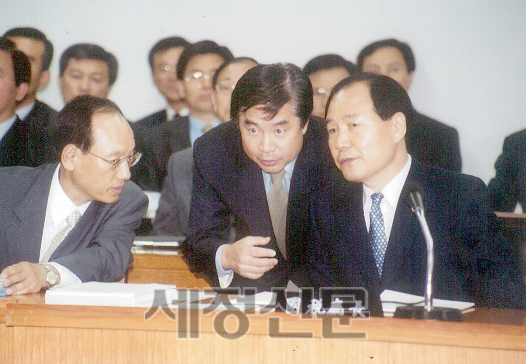 2001년도는 세정가에 태풍이 몰아쳤다. 언론사에 대한 특별세무조사가 연초부터 시작된 것이다. 특별세무조사는 조선일보, 동아일보, 중앙일보를 비롯 23개 언론사가 그 대상이었다. 사상 유례가 없는 대대적인 언론사특별세무조사는 정치적으로도 매우 민감한 반향을 불러 일으켰다. 따라서 그 해 국세청에 대한 국회 국정감사는 당시 야당인 한나라당 위원들은 적극적인 공세로 파행을 거듭하는 등 큰 홍역을 치렀다. 사진은 2001년 국세청 국정감사에서 손영래 국세청장(오른쪽)이 의원들 질의에 답하면서 곽진업 국세청 차장(왼쪽)과 최명해 국세청 기획관리관의 의견을 듣고 있는 모습.<세정신문DB>