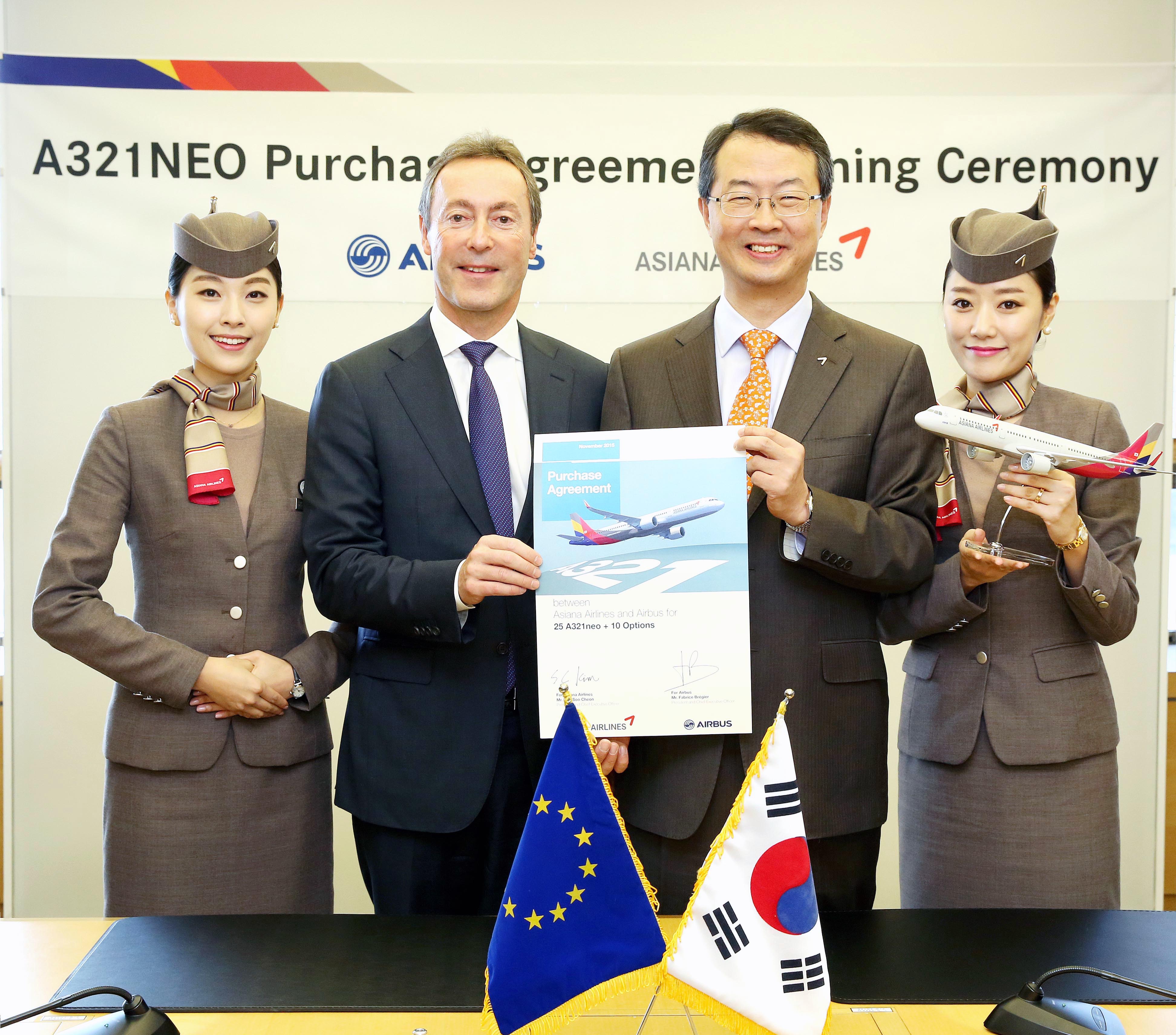아시아나항공(사장. 김수천)이 3일 강서구 오쇠동 아시아나타운에서 파브리스 브레지에 에어버스 CEO 등이 참석한 가운데 에어버스사의 차세대 중소형기 A321-200 NEO(New Engine Option) 25대의 구매 및 도입을 위한 서명식을 실시했다.