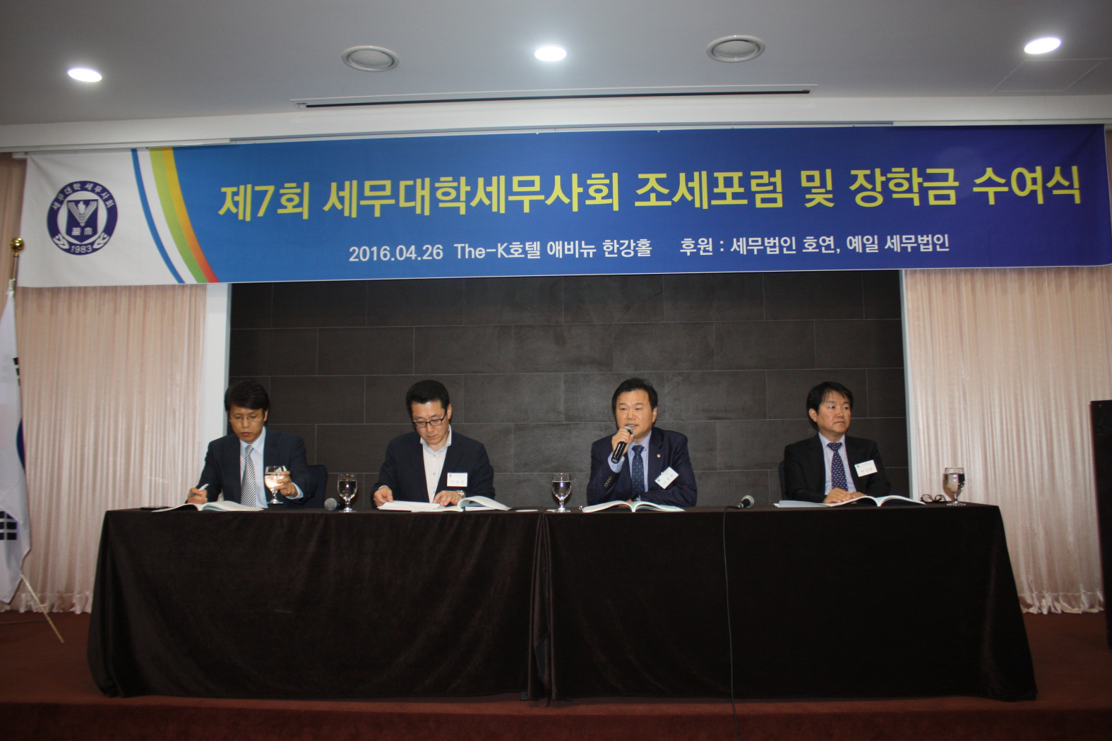 세무대학 출신 세무사들의 모임인 세무대학세무사회(회장 김승한)는 26일 양재동 더-케이 호텔 애비뉴 한강홀에서 제7회 세무대학세무사회 조세포럼 및 장학금 수여식을 개최했다.