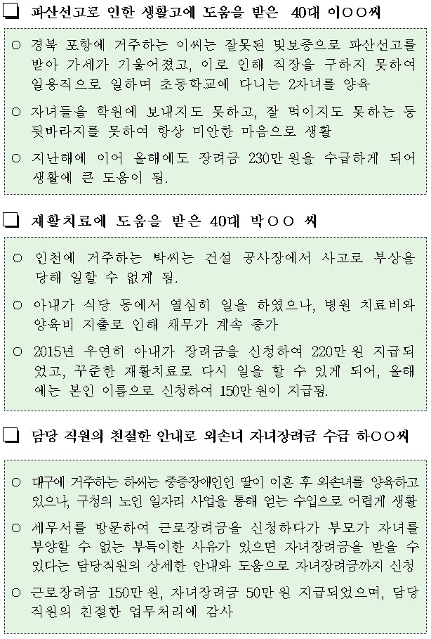 [근로장려금]중산층 시련극복 도움, 장려금수급 미담사례
