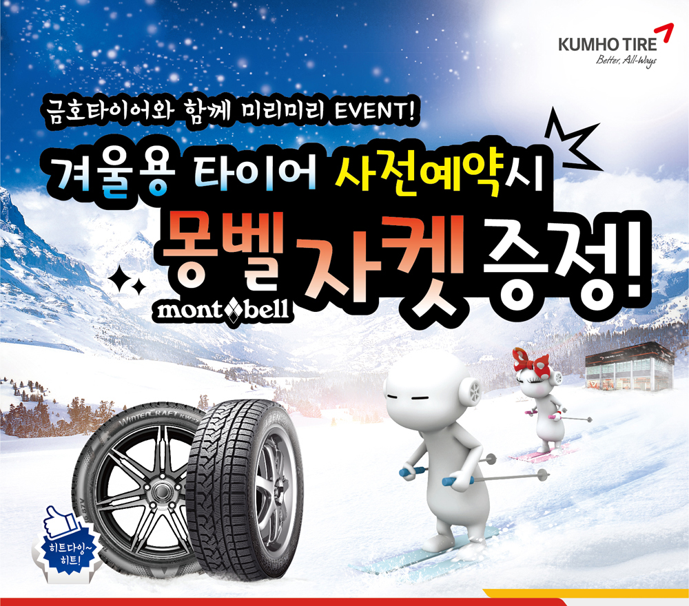 대상 제품은 승용차용 겨울용 타이어인 윈터크래프트 KW27과 SUV용 아이젠 RV KC15으로 4개 구매시 고급 아웃도어 브랜드의 플리스(fleece) 자켓도 증정한다.