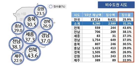 또한 전국 17개 시·도를 징수환경이 비슷한 3개 권역(수도권, 광역시, 도)로 나눠 세부적으로 살펴보면, 전체 체납액의 68.5%인 수도권의 징수율은 전국 평균 25.9%보다 낮은 22.3%로 나타났다.
