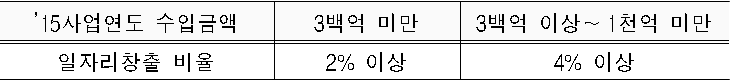 수입금액 규모별 일자리창출 비율을 보면 3백억원 미만 법인은 2%이상, 3백억 이상~1천억 미만 법인은 4%이상 일자리를 늘려야 혜택을 받을수 있다.