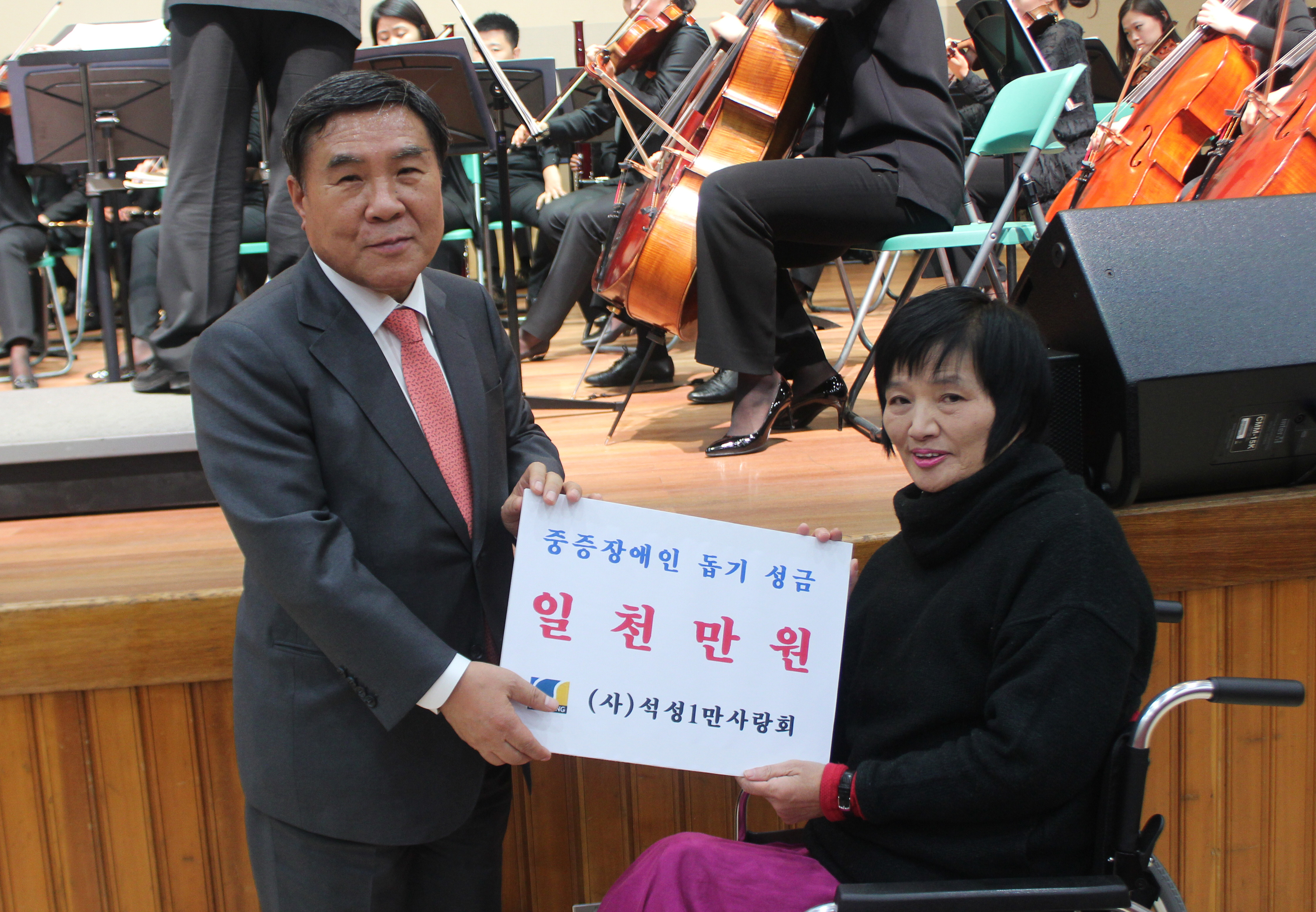 석성1만사랑회 조용근 이사장은 이날 자선음악회에 참석한 ‘석성 나눔의집 1호점’ 김성자 원장에게 자선음악회를 통해 모여진 성금 1천만을 전달했으며, “성금을 모아주신 모든 후원자들께 진심으로 감사의 말씀을 드리며, 차가운 날씨임에도 마음이 따뜻한 많은 분들이 참석해 주셔서 고마움을 느낀다”고 말했다.