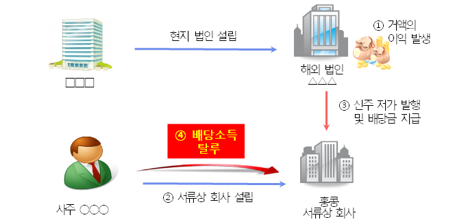 □□□의 사주 B는 해외 현지법인 △△△의 이익이 증가하자 배당금을 탈루할 목적으로 □□□의 해외 현지법인 △△△에게 사주 개인이 홍콩에 설립한 서류상 회사에 신주를 저가로 발행하게 하고 고액의 배당금을 지급했다.