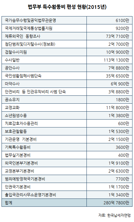납세자연맹은 특수활동비가 남용되는 법무부의 사례 가운데, △연구활동비 △법률지원비 △범죄수사활동비 △수사활동비 △자료수집활동비 △직무활동비 △업무지원활동비 △체류외국인동향조사 △국민생활침해단속비 등을 꼽았다.