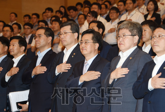 김동연 경제부총리 겸 기재부장관 취임식이 15일 정부세종청사에서 개최됐다. 김 부총리는 취임사를 통해 "새 정부 경제팀은 ‘일자리 중심 선순환 경제생태계’를 만드는 것을 목표로 한다"고 밝혔다.