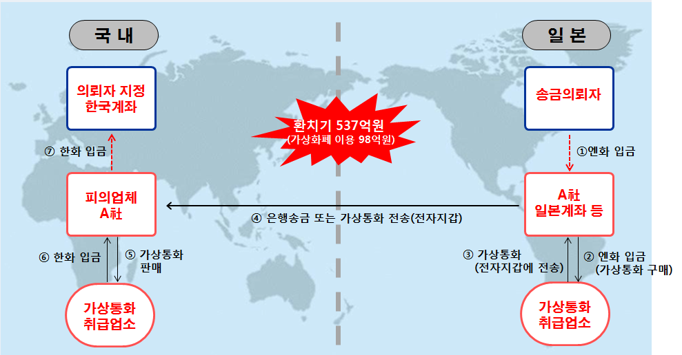 일본에서 모금한 자금을 A社가 관리하는 국내계좌로 ① 은행송금(439억원)하거나, ② 일본에서 가상통화를 구매(98억원)하여 국내로 전송․판매하여 현금화 하는 방식으로 환치기 자금원으로 사용