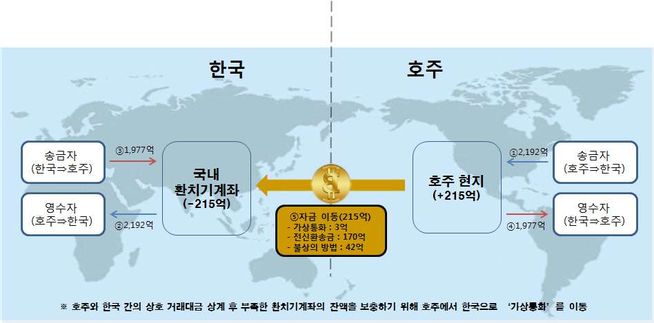 특히, 이들은 한·호주간 환치기운영 과정에서 한국의 운영자금이 부족하게 되자 이를 보충하기 위하여 215억원을 불법적으로 송금하고, 이 중 3억원은 가상통화로 전송.