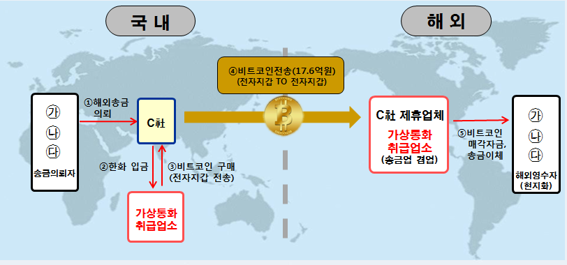 C社는 해외송금을 원하는 의뢰인들로부터 원화자금을 영수하여 가상통화 취급업소에서 비트코인을 구매한 후, 해외 제휴업체에 비트코인을 전송하여 송금의뢰인이 지정한 해외수령인에게 현지 통화를 지급하는 수법으로 16.10월부터 17.5월까지 약 17억원 상당의 무등록외국환업무(불법 환치기)를 영위.