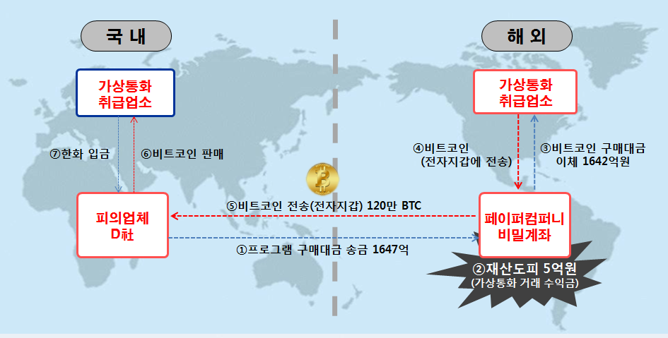 D社는 해외에서 비트코인을 구매할 목적으로 해외에 페이퍼컴퍼니를 설립하고 소프트웨어 구매 계약서를 작성해서 은행에 제출하여 15.12월부터 17.12월까지 약 1천647억원을 해외 페이퍼컴퍼니 명의 계좌로 송금하여 불법 해외예금한 후 비트코인을 구매.