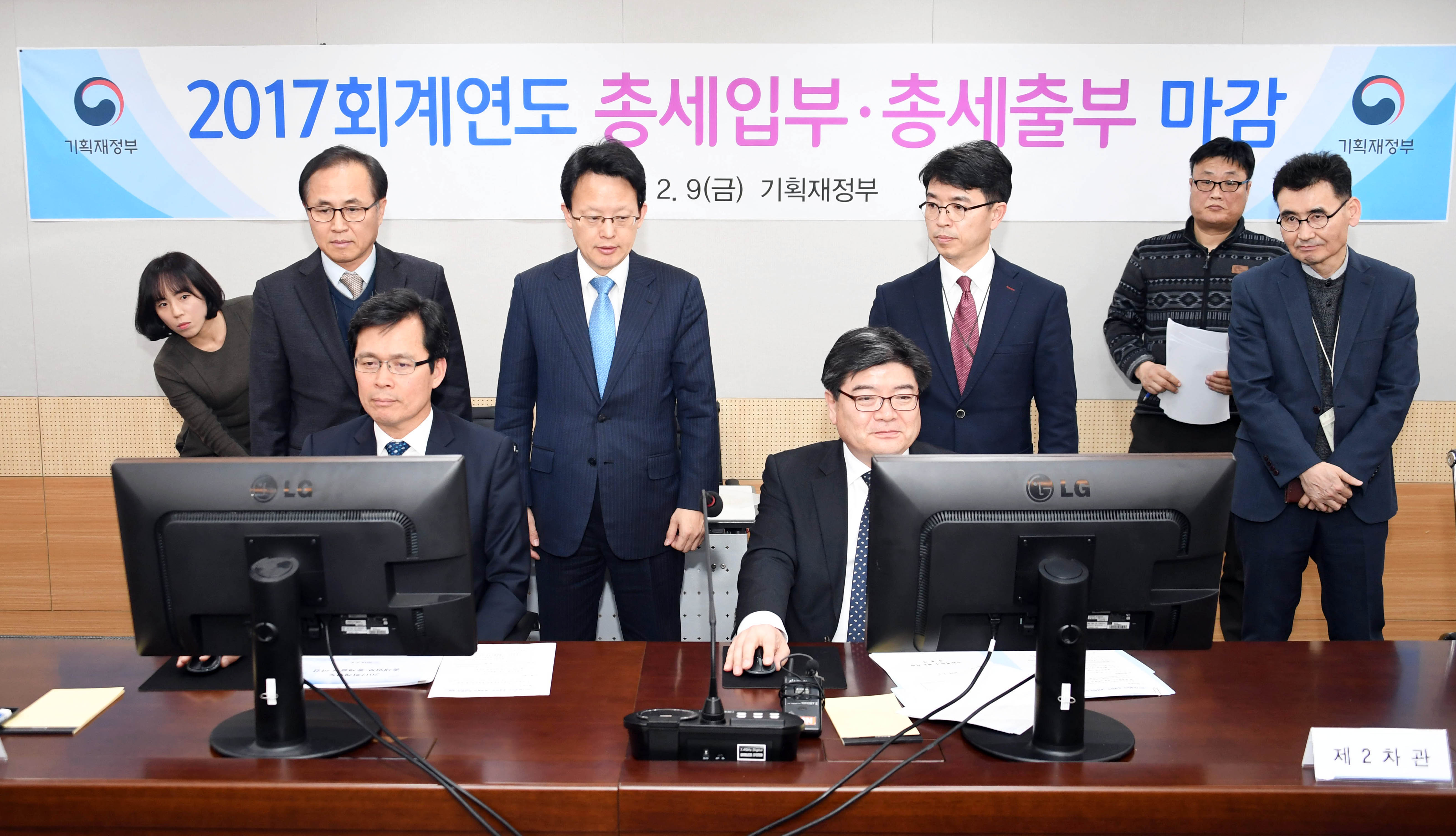 김용진 기획재정부 제2차관은 9일 한국재정정보원에서 감사원의 정길영 감사위원 등이 참석한 가운데 2017 회계연도의 총세입부와 총세출부를 마감하고, 지난해 정부의 세입.세출 실적을 확정했다.