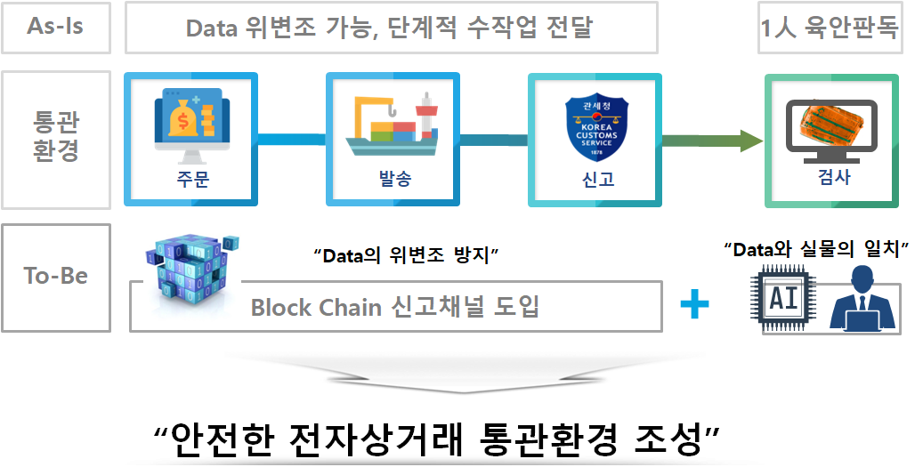 4차 산업혁명의 신기술인 블록체인 기술을 기반으로 전자상거래 정보를 신속하게 확보하고, 인공지능 X-ray 판독을 통해 보다 안전한 물품통관이 이뤄질 수 있도록 하는 혁신적인 해외직구 통관기반이 구축됐다.